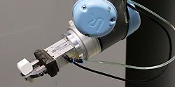 有UR5机器人往往四数控机器铣牙冠优化生产周期的很大一部分Glidewell实验室在纽波特海滩,加利福尼亚州。gydF4y2Ba